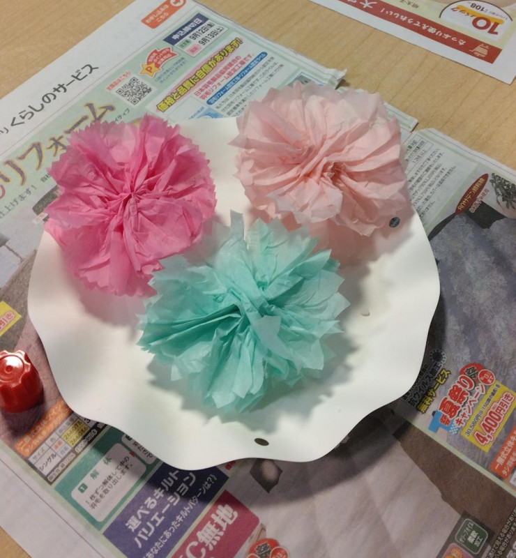 お花の真ん中に、ポンポンやボタン、フェルトで作ったものをボンドで止めます